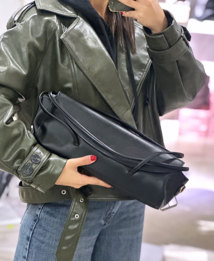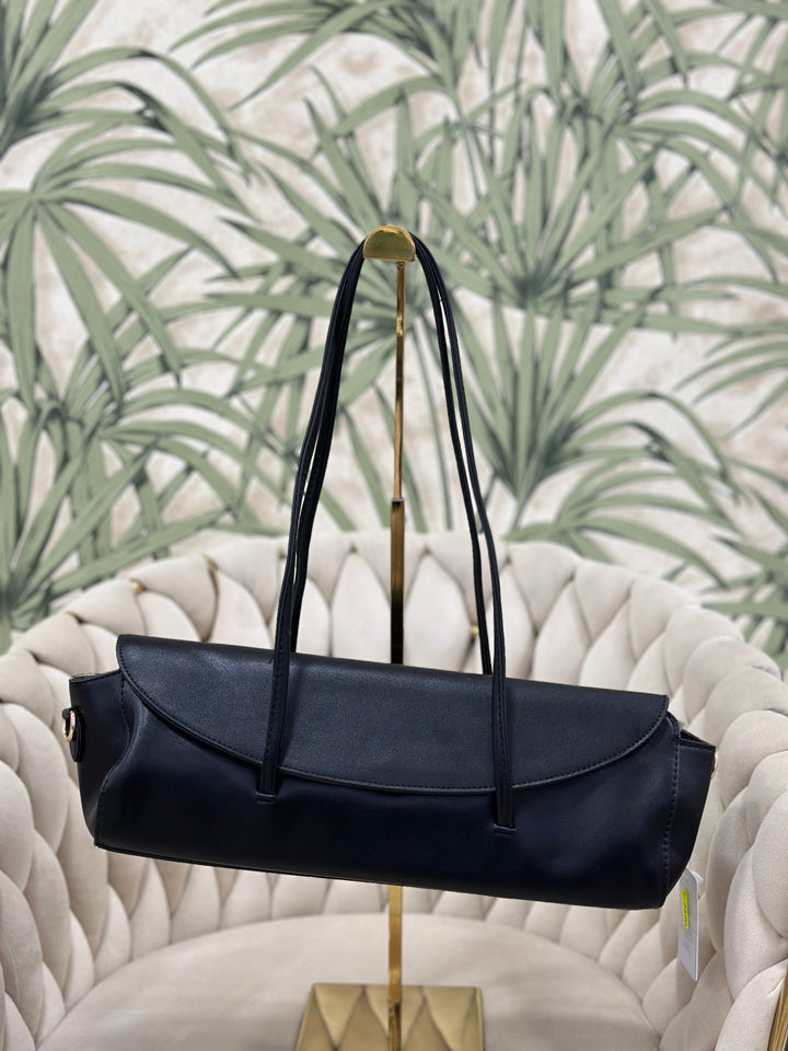 Borsa in ecopelle rigida, munita anche di tracolla rimovibile.